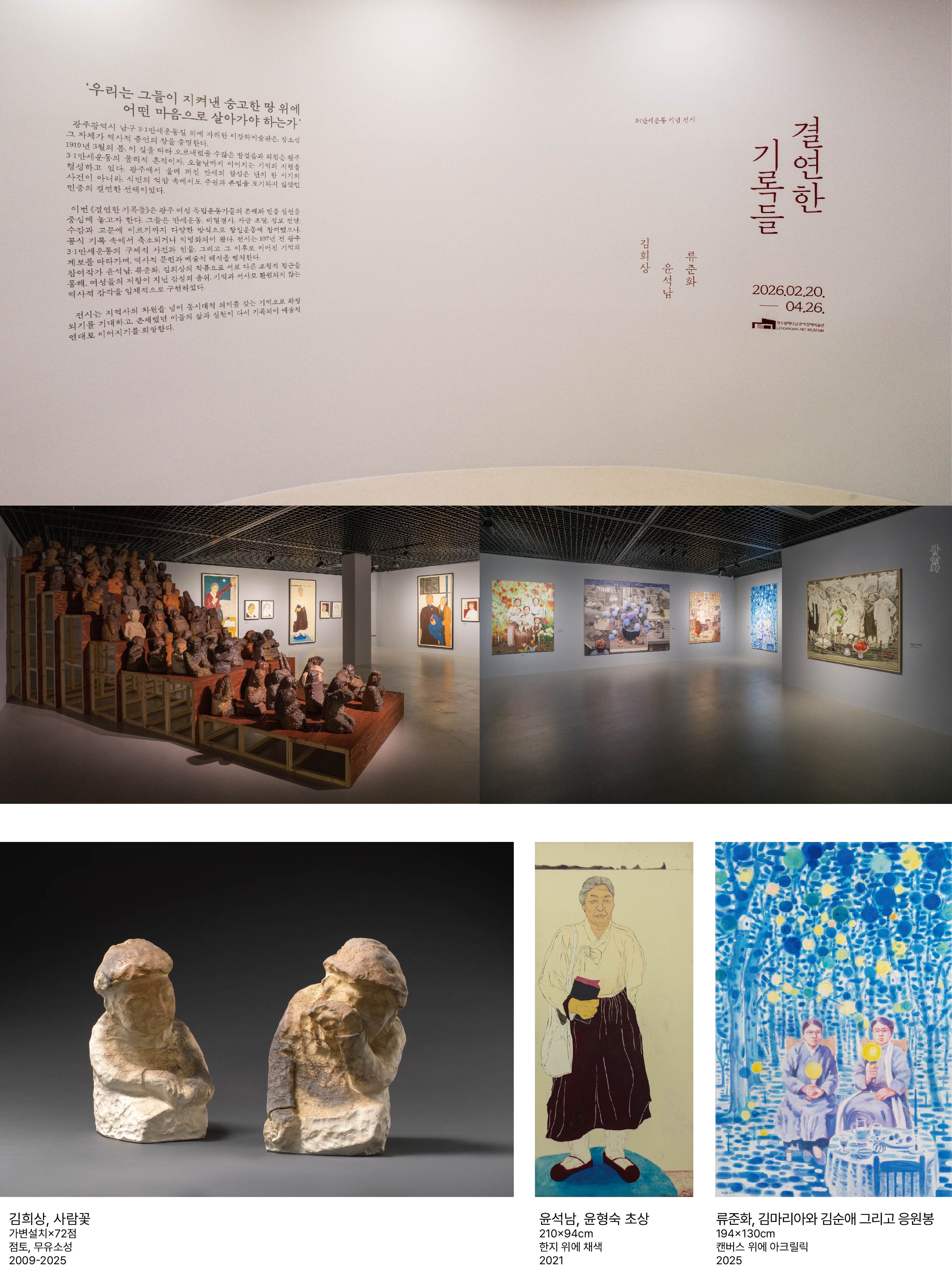 《결연한 기록들》은 광주 여성 독립운동가들의 존재와 민중 실천을 중심에 놓고자 한다. 그들은 만세운동, 비밀결사, 자금 조달, 정보 전달, 수감과 고문에 이르기까지 다양한 방식으로 항일운동에 참여했으나, 공식 기록 속에서 축소되거나 익명화되어 왔다. 전시는 107년 전 광주 3.1만세운동의 구체적 사건과 인물, 그리고 그 이후로 이어진 기억의 계보를 따라가며, 역사적 문헌과 예술적 해석을 병치한다. 참여작가 윤석남, 류준화, 김희상의 작품으로 서로 다른 조형적 접근을 통해, 여성들의 저항이 지닌 감정의 층위, 기억과 서사로 환원되지 않는 역사적 감각을 입체적으로 구현하였다.